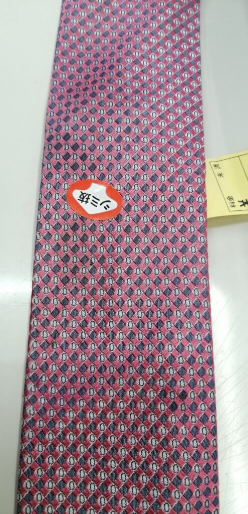 この「こする」行為!気をつけてください。ネクタイはほぼシルクでできているので、摩擦の圧力に非常に弱い素材です!なのでおしぼりなのでこすってしまうと生地が傷み白くなってしまいます。