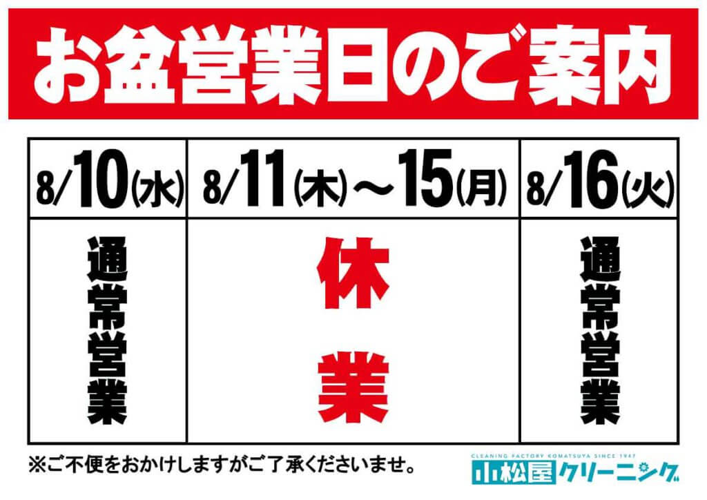 8月11日木曜日~8月15日月曜日までの期間、 誠に恐れ入りますが全店舗・工場ともにお休みさせていただきます。 ご迷惑お掛け致しますがよろしくお願い致します。 併設コインランドリーにつきましては24時間年中無休で営業いたします。