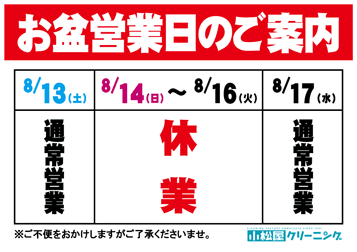 8月11日木曜日~8月15日月曜日までの期間、 誠に恐れ入りますが全店舗・工場ともにお休みさせていただきます。 ご迷惑お掛け致しますがよろしくお願い致します。 併設コインランドリーにつきましては24時間年中無休で営業いたします。
