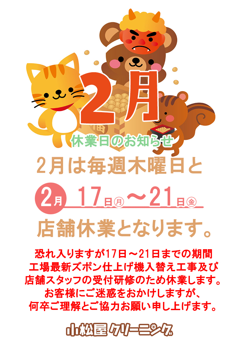 2月17日(土)~21日(金)の期間,休業いたします 2025.02.152025.02.17 2月17日(土)~21日(金)の期間、 恐れ入りますが工場内配管工事及び最新ズボン仕上げ機入替え工事、 また店舗スタッフの受付研修のため、休業とさせていただきます。 お客様にはご不便をおかけいたしますが、何卒ご理解とご協力をお願い申し上げます。 22日土曜日より通常営業致します。