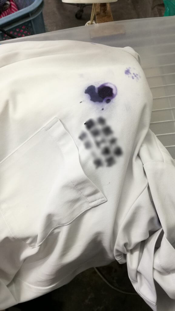 こちらの白衣はお客様が家庭洗いでボールペンと脱水してしまい大変な事になっていました💦